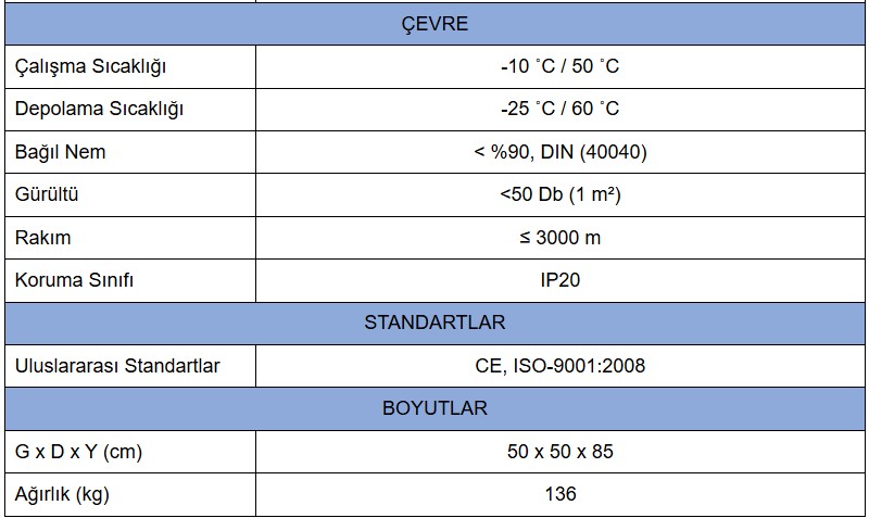 - Aşırı Yük, Yüksek/Düşük Voltaj, Aşırı Sıcaklık Koruması