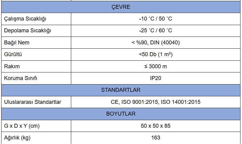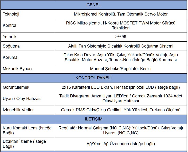 - Aşırı Yük, Yüksek/Düşük Voltaj, Aşırı Sıcaklık Koruması