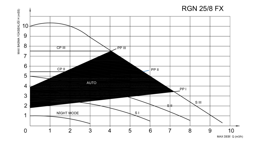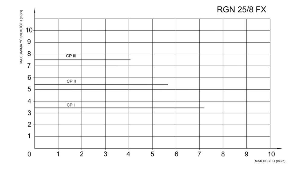 CP (SABİT BASINÇ EĞRİSİNDE) ÇALIŞMA SEÇENEĞİ : Pompa ayarlamış olduğunuz sabit basınç eğrisinde çalışarak akış debisini ayarlar. Pompa basıncı seçmiş olduğunuz moda göre sabit kalır ve pompa bu çizgi üzerinde çalışır.
