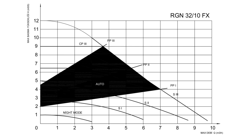 PP (ORANSAL BASINÇ EĞRİSİNDE) ÇALIŞMA SEÇENEĞİ : Sistemin akış ihtiyacına göre çalışma modudur. Sitemin basıncı düştüğünde pompa hızı artar sitemin basıncı yükseldiğinde ise pompa hızı düşer döner.